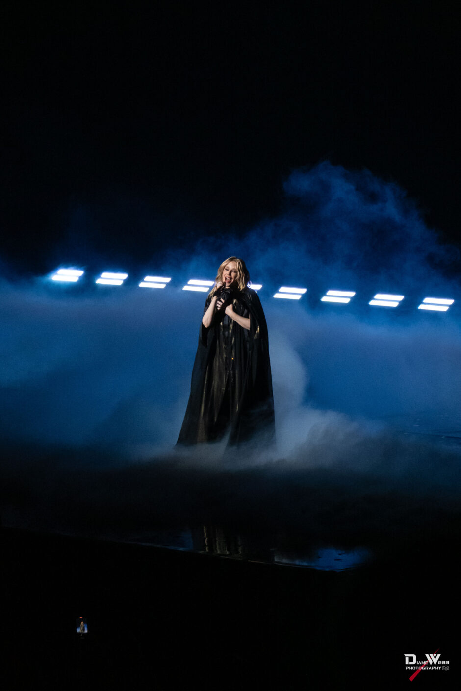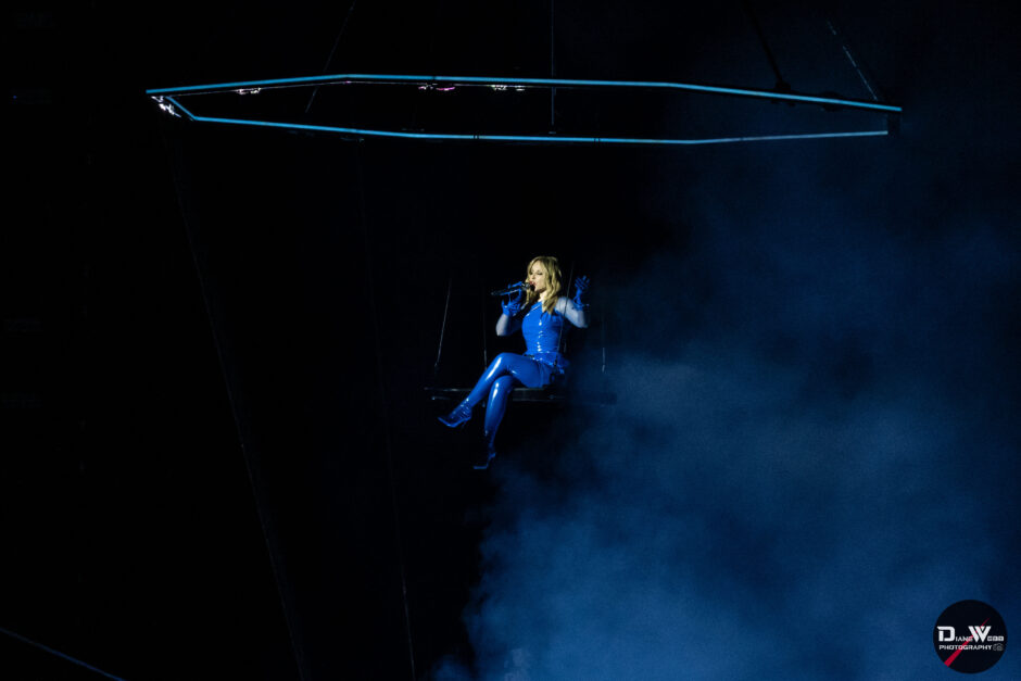 As the arena lights dimmed, a cheer rose from the crowd. Minogue appeared seated on a swing suspended above the stage, opening the show with “Lights, Camera, Action” against a dreamy blue backdrop with fog and spotlights focused on her.