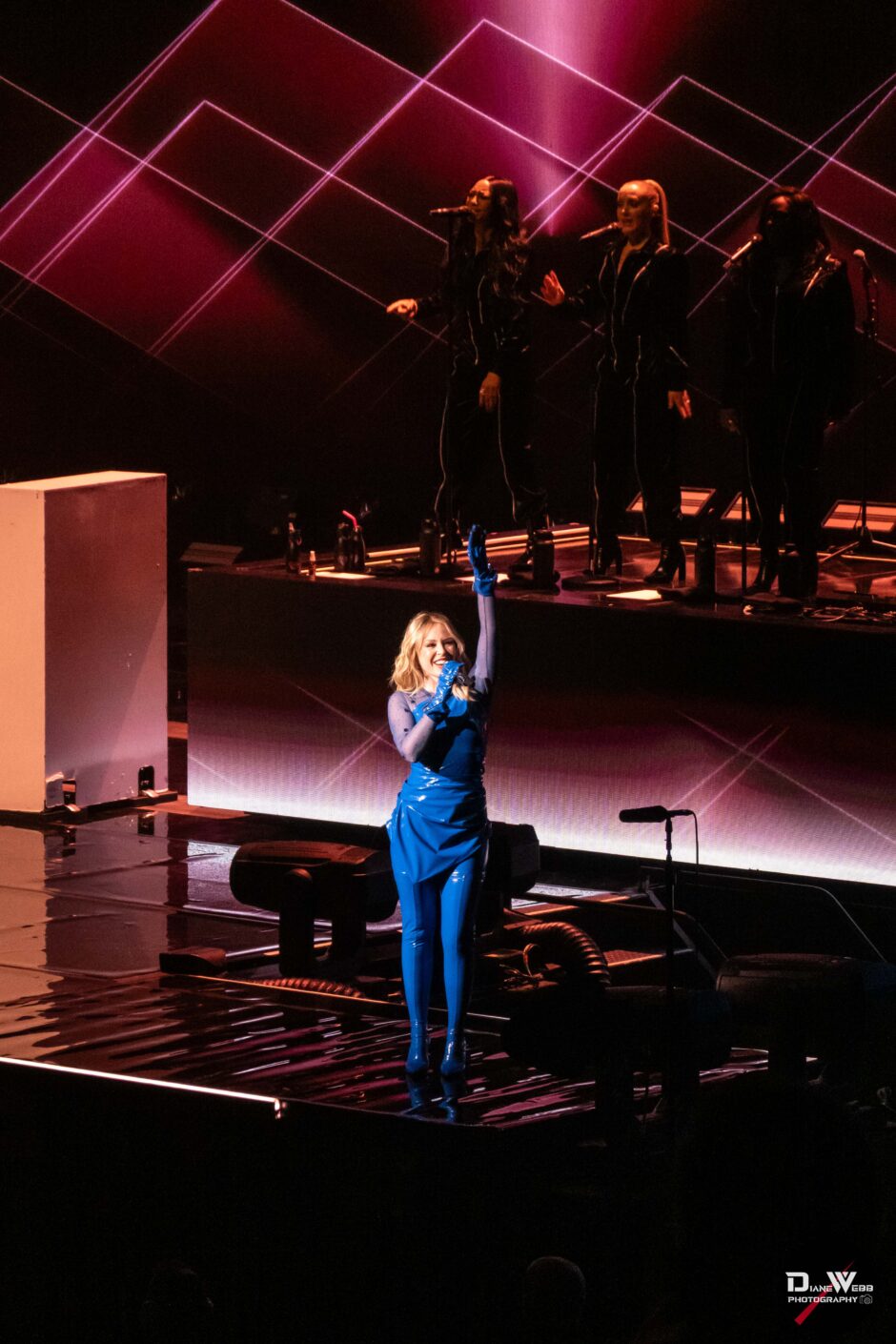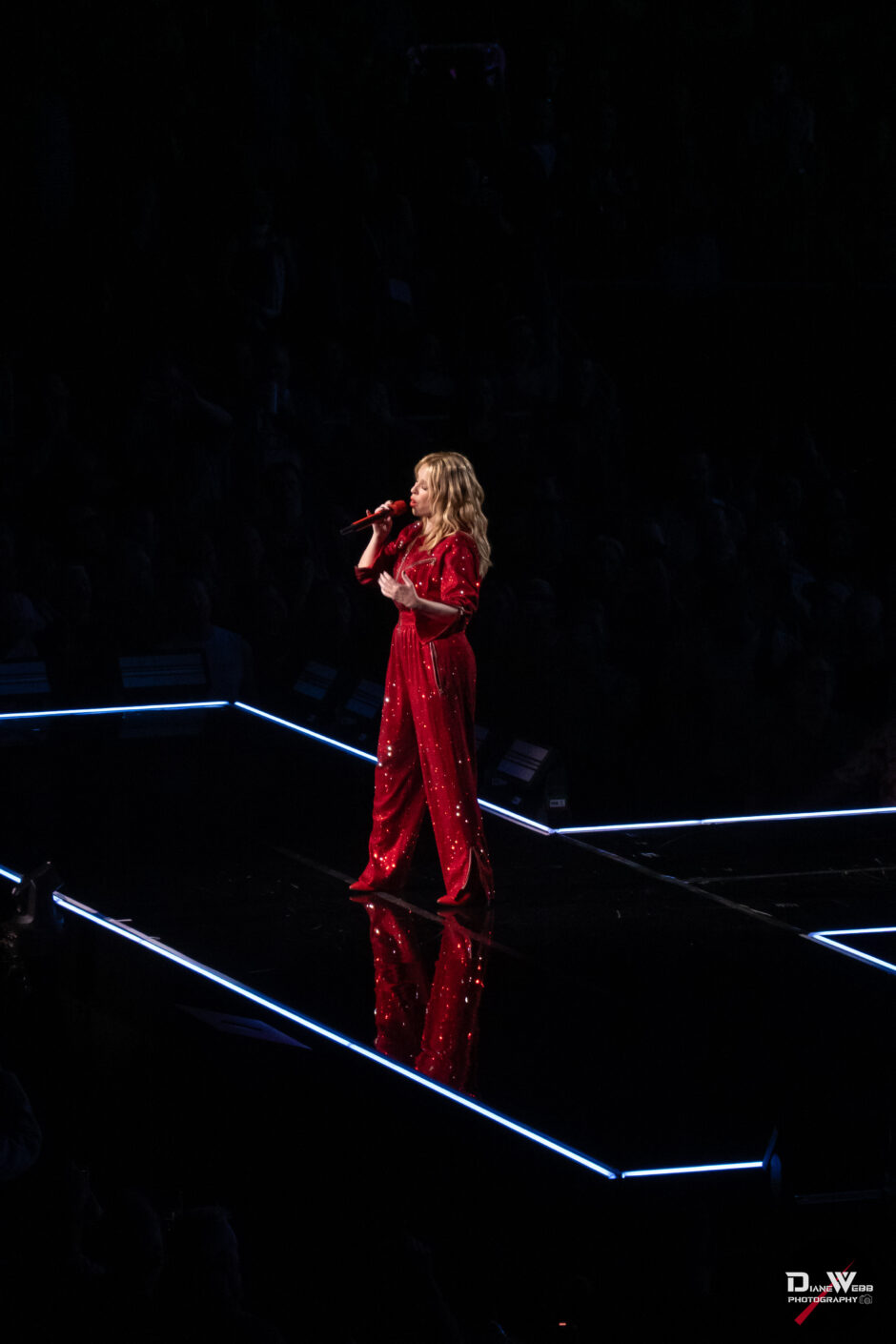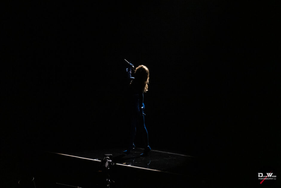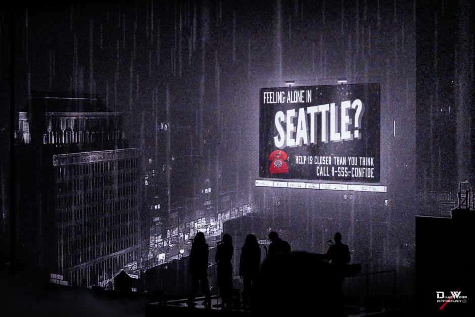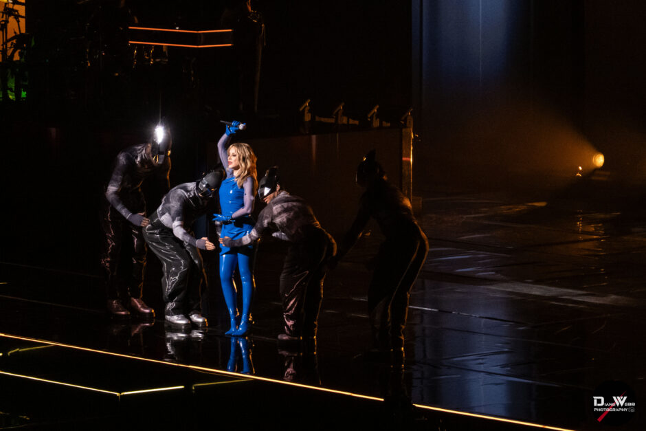 Act Four shifted gears with a more introspective mood. During “Confide,” a moody LED backdrop featured a slide for those feeling alone in Seattle to “Confide” with the image of phone next to a sign reading 1-555-CONFIDE (not a real mental health call line, but leading into the song being performed). Minogue emerged in a black floor-length cape under pulsing blue and red lights, her vocals soaring in a solo spotlight that added theatrical weight to the moment.