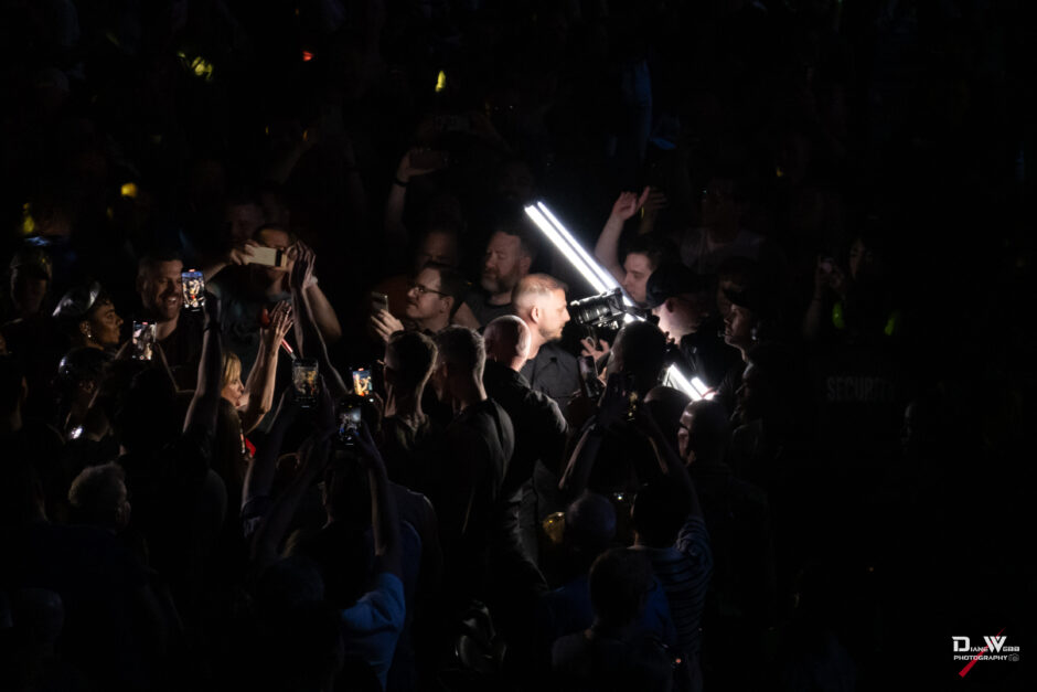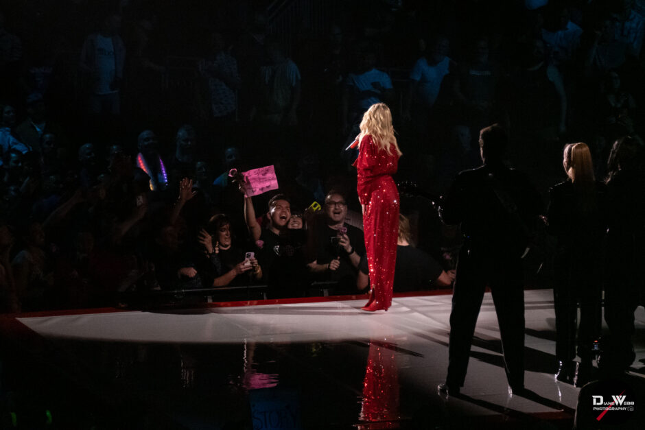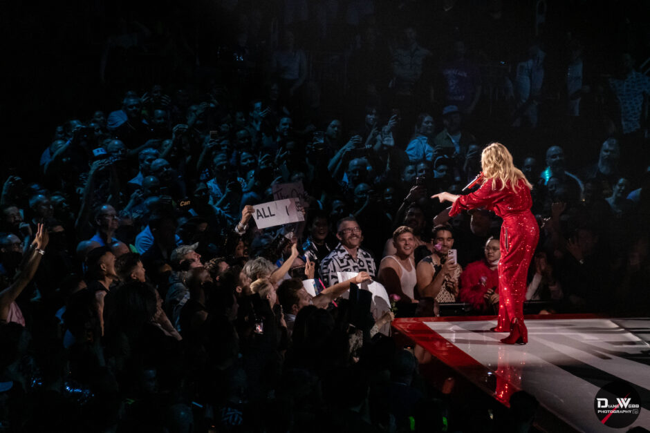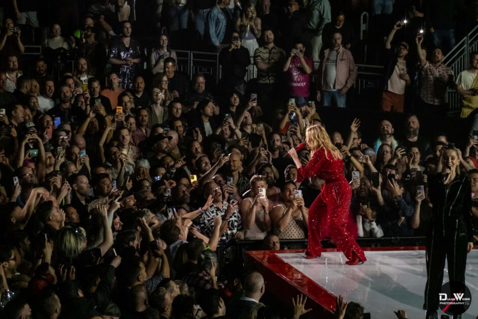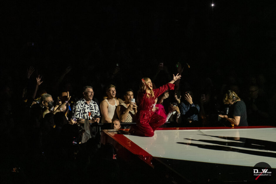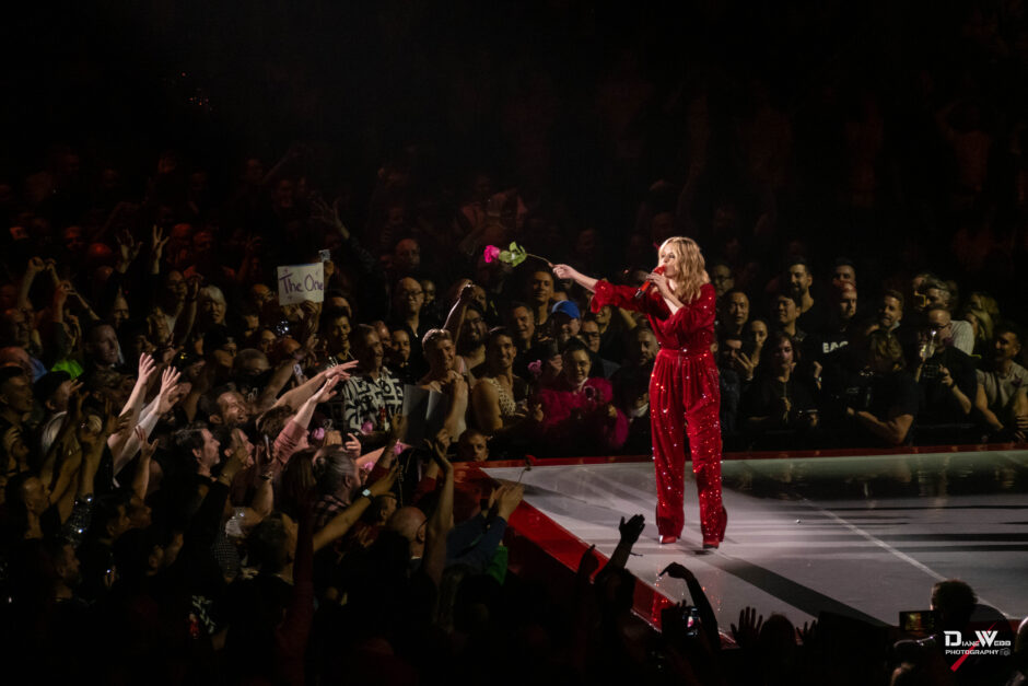 Act Three took Minogue through the crowd to a B-stage at the rear of the venue, allowing her to perform up close to fans in all directions. Surrounded by audience members on all four sides, she paused to take song requests, calling out to fans with handmade signs. She then delivered a rare live rendition of “Tightrope,” performing it for the first time since 2012.