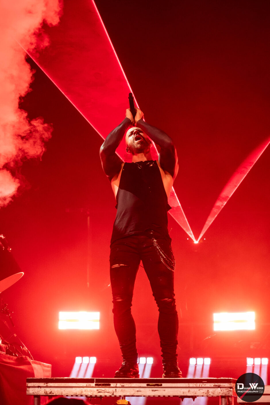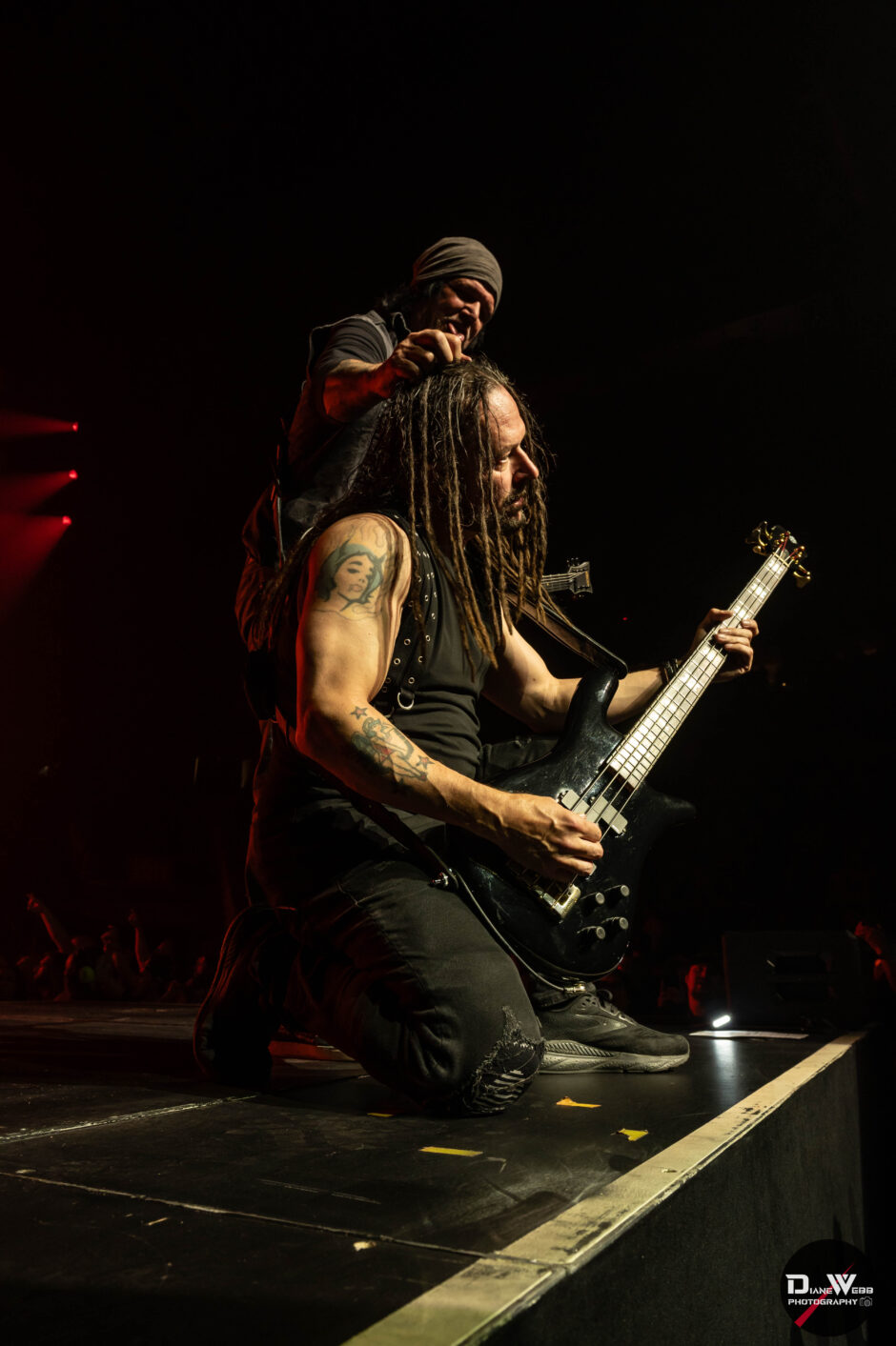 The stage itself was a spectacle, a catwalk extended deep into the crowd, while lights, a towering demonic figure, CO2 cannons, video monitors and bursts of pyrotechnics transformed the space into a sensory overload. This time, thankfully, the fire effects avoided any mishaps, unlike the scorched banners at their Chicago stop. The band tore through The Sickness with brutal precision, with bassist John Moyer and guitarist Dan Donegan igniting the crowd as they leapt across the stage, traded solos and stormed down the catwalk. In a fun moment, Moyer knelt down and Donegan playfully patted his head before they launched into a synchronized jump, smiling as they connected with fans just feet away.
