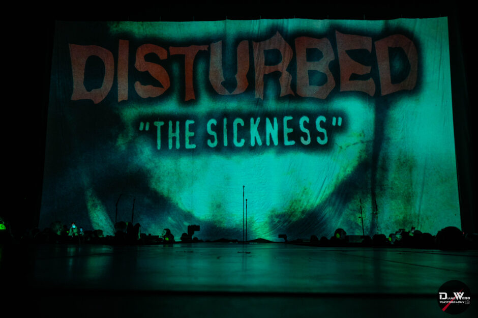As the crowd buzzed with anticipation, Disturbed took the stage in theatrical fashion. Before the lights dropped, KISW’s Ryan Castle warmed up the crowd, joking, “Who planned a Disturbed show on Cinco de Mayo? Metalheads are here to party,” prompting a wave of cheers and laughter. A massive screen behind the stage flashed rotating visuals, the iconic The Sickness album art, slogans like “Spread the Sickness,” and nostalgic band photos, building the tension to a fever pitch.