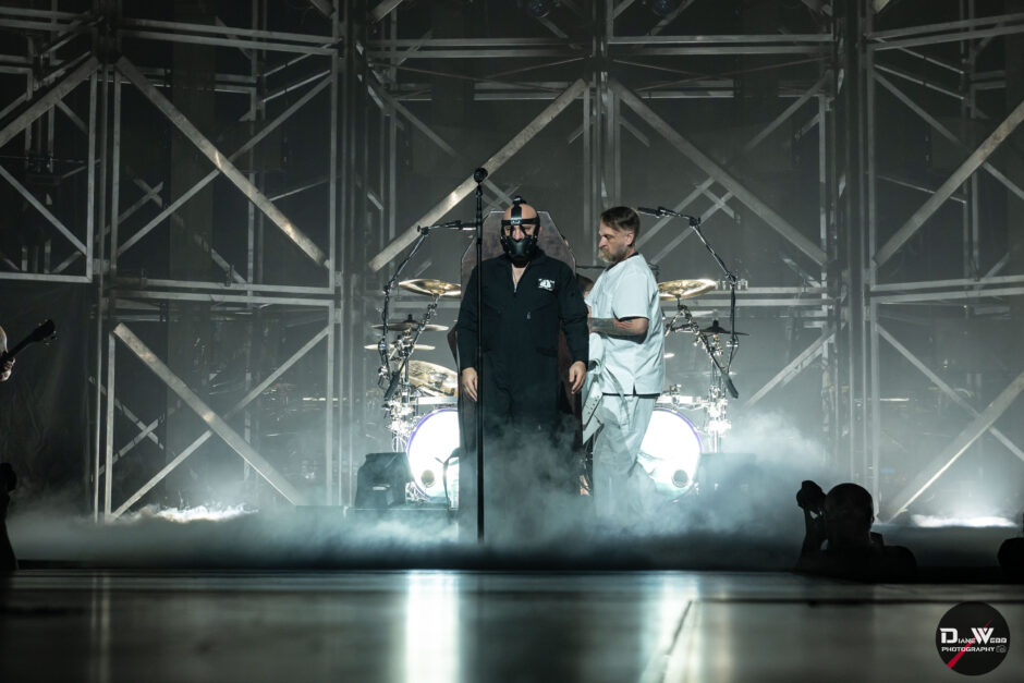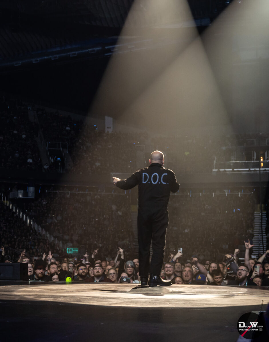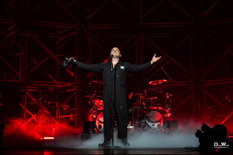 The first act of Disturbed’s set was a complete playthrough of The Sickness, performed in order, something fans had waited 25 years to witness. Frontman David Draiman was wheeled onstage in a black DOC jumpsuit, strapped into a straitjacket and wearing a muzzle. As the restraints were removed, Draiman stood tall, spread his arms, tilted his head back while rolling his eyes, and let the opening notes of “Voices” wash over the crowd. The arena erupted.