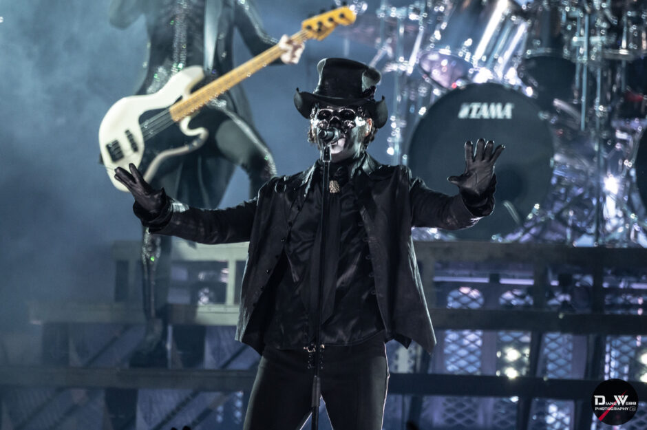 At the center stood Tobias Forge in his latest incarnation, Papa V Perpetua. Where previous personas often leaned heavily into exaggerated theatricality, from the imperious early Papas to the mischievous charm of Cardinal Copia, Papa V presents a more restrained, controlled presence. The half-mask design allows greater vocal freedom, and Forge’s singing reflected that: clearer highs, more sustained phrasing, and a confidence that prioritized musicianship over caricature.